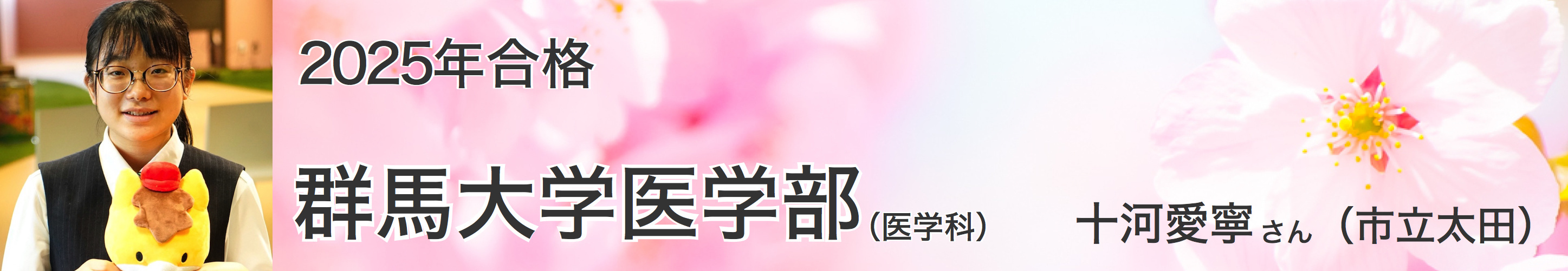 私は太田高校に合格するため、中学2生までは赤門セミナーで自分の苦手科目である国語をサポートクラスで勉強し、 中学範囲の予習として数学もサポートクラスで勉強していました。 また、英語はグループ授業で中学範囲を少し先取りした内容を勉強していました。 中学2年生の2学期頃から、理科と社会のサポートクラスや東進の数学の映像授業で、高校内容の勉強もし始めました。 東進の数学の映像授業では、中学校を卒業するまでには、数IIBを終えていました。数IAに比べると、数IIBは当然難しかったです。 その中で一番大変だったのは対数関数でした。なかなか対数の定義が頭に入っていきませんでした。 一番楽しかったのは、三角関数でした。加法定理も楽しいのですが、積和公式や和積公式の方が楽しかったです。 また中学3年生になってから、英語は高校1年生の内容を学ぶグループ授業をとっていました。その授業をとっていたおかげで、 英検2級に合格しました。その際に最も大変だったのは、リスニングでした。 試験直前までずっとやっていましたが、合格点に届いたのはほんの数回でした。でも、あきらめずに勉強して合格しました。 中学3年間、地道に勉強して太田高校に合格することができました。