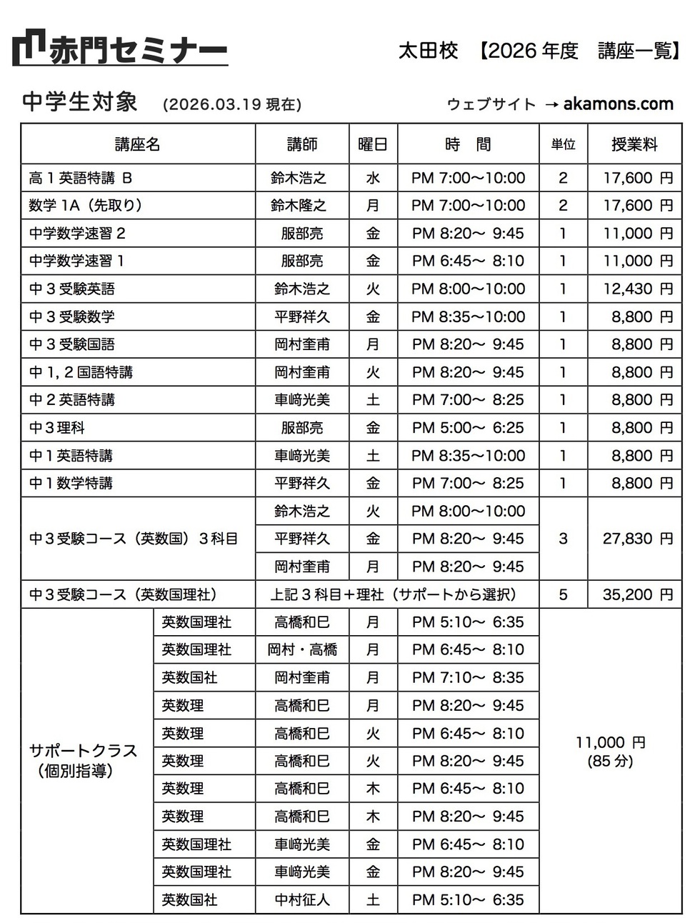 私は太田高校に合格するため、中学2生までは赤門セミナーで自分の苦手科目である国語をサポートクラスで勉強し、 中学範囲の予習として数学もサポートクラスで勉強していました。 また、英語はグループ授業で中学範囲を少し先取りした内容を勉強していました。